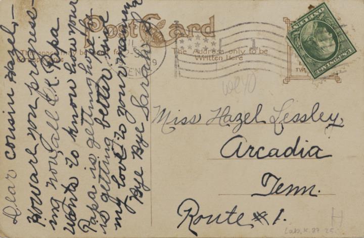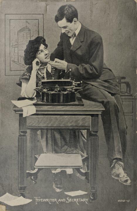 Illustrierte Postkarte; Fotografie, monochrom; Nr. 6010-C Rückseite: Vorgesetzter/Mitarbeiter und Sekretärin mit Schreibmaschine in romantischer Büroszene Vorderseite: beschrieben; adressiert an Miss Lesley, Arcadia; Briefmarke U.S. Postage One Cent; Bristol/Jul 28 1909