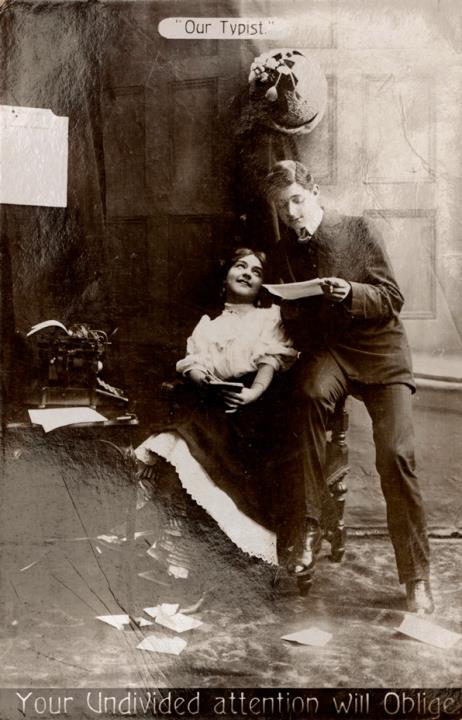 Illustrierte Postkarte; Fotografie, monochrom Rückseite: Vorgesetzter/Mitarbeiter und Sekretärin mit Schreibmaschine in romantischer Büroszene, Text: Your undivided attention will oblige. Vorderseite nicht beschrieben