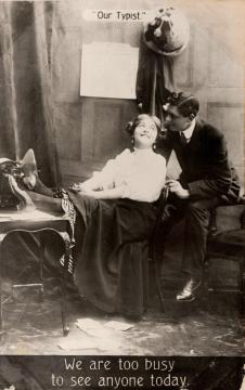 Illustrierte Postkarte; Fotografie, monochrom; Rückseite: Vorgesetzter/Mitarbeiter und Sekretärin mit Schreibmaschine in romantischer Büroszene, Text: A good view. Vorderseite nicht beschrieben