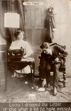 Illustrierte Postkarte; Fotografie, monochrom Rückseite: Vorgesetzter/Mitarbeiter und Sekretärin mit Schreibmaschine in romantischer Büroszene, Text: Lucky I dropped the Letter [...] Vorderseite nicht beschrieben
