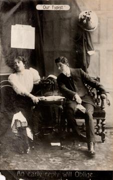 Illustrierte Postkarte; Fotografie, monochrom Rückseite: Vorgesetzter/Mitarbeiter und Sekretärin mit Schreibmaschine in romantischer Büroszene, Text: An early reply will oblige Vorderseite nicht beschrieben