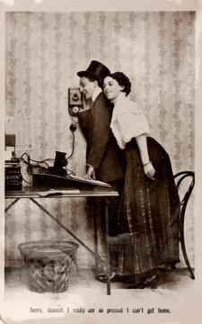 Illustrierte Postkarte; Fotografie, monochrom Rückseite: Büroszene; Vorgesetzter und Sekretärin beim Telefonieren Vorderseite: beschrieben; adressiert an Miss Leddon; Briefmarke Postage Revenue (U.K.) Half Penny; Poststempel Market Harborough/ Au 25 1910