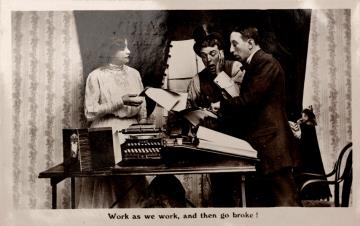 Illustrierte Postkarte; Fotografie, monochrom Rückseite: Büroszene; entsetzter Vorgesetzte mit Sekretärin und Buchhalter, Tisch mit Schreibmaschine Yost Vorderseite nicht beschrieben