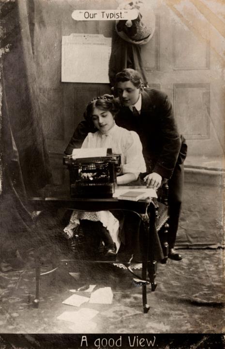Illustrierte Postkarte; Fotografie, monochrom; Rückseite: Vorgesetzter/Mitarbeiter und Sekretärin mit Schreibmaschine in romantischer Büroszene, Text: A good view. Vorderseite nicht beschrieben