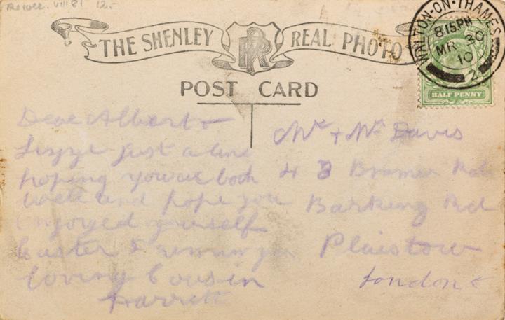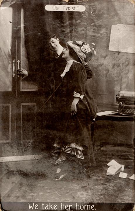 Illustrierte Postkarte; Fotografie, monochrom Rückseite: romantische Büroszene; Vorgesetzter/Mitarbeiter und Sekretärin, das Büro verlassend, Text: We take her home Vorderseite: beschrieben; adressiert an Mr.+Mrs. Davis, London; Briefmarke Postage Revenue (U.K.) Half Penny; Poststempel Walton on Thames/Ma 30 1910