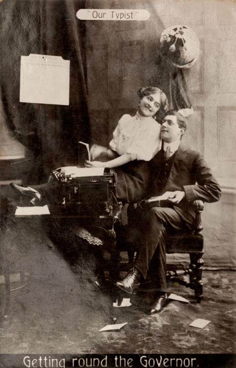 Illustrierte Postkarte; Fotografie, monochrom Rückseite: Vorgesetzter/Mitarbeiter und Sekretärin mit Schreibmaschine in romantischer Büroszene, kleiner Tisch mit Schreibmaschine, Text: Getting round the Governor. Vorderseite nicht beschrieben