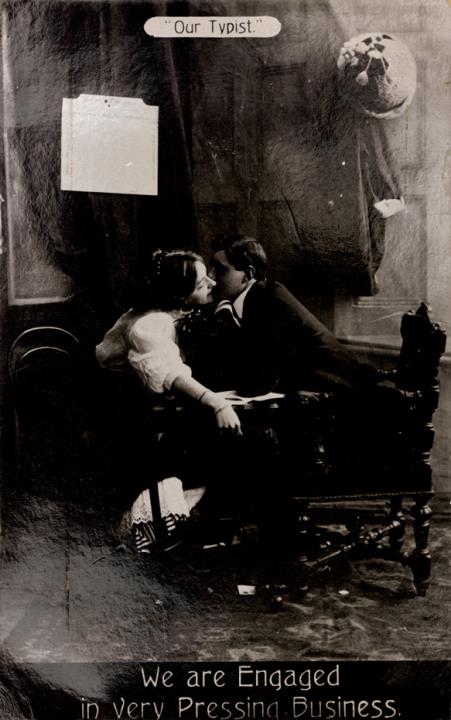 Illustrierte Postkarte; Fotografie, monochrom Rückseite: Vorgesetzter/Mitarbeiter und Sekretärin in romantischer Büroszene, Text: We are engaged in very pressing business Vorderseite nicht beschrieben