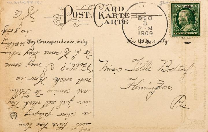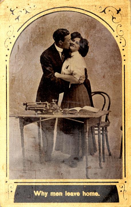 Illustrierte Postkarte; Grafik, Fotografie, polychrom Rückseite: Vorgesetzter/Mitarbeiter und Sekretärin in romantischer Büroszene, kleiner Tisch mit Schreibmaschine Vorderseite: beschrieben, adressiert an Miss Bodtorf, Flemington; Briefmarke U.S. Postage One Cent; Poststempel Dec 3 1909