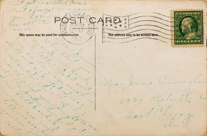 Illustrierte Postkarte; Fotografie, monochrom; Serie A.B.R. Rückseite: Büroszene; Vorgesetzter und Sekretärin mit Schreibmaschine Vorderseite: beschrieben; adressiert an Miss Cunningham, East Chicago; Briefmarke U.S. Postage One Cent; Poststempel Indiana Harbor/Jun 19 1912