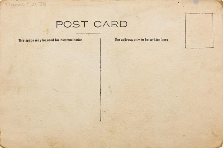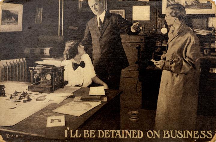 Illustrierte Postkarte; Fotografie, monochrom; Serie A.B.R. Rückseite: Büroszene; Vorgesetzter und Sekretärin mit Schreibmaschine, ein Mann wird abgewiesen Vorderseite nicht beschrieben