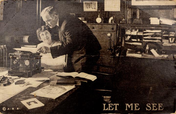 Illustrierte Postkarte; Fotografie, monochrom; Serie A.B.R. Rückseite: Büroszene; Vorgesetzter und Sekretärin mit Schreibmaschine Vorderseite beschrieben