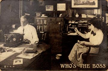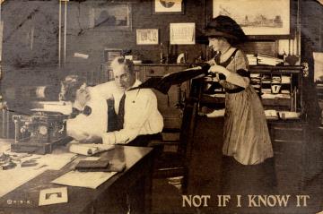 Illustrierte Postkarte; Fotografie, monochrom; Serie A.B.R. Rückseite: Büroszene; Vorgesetzter und Sekretärin als Paar, Ehefrau betritt den Raum Vorderseite: beschrieben; adressiert an Mr. Chown, Iowa; Briefmarke U.S. Postage 1 Cent; Poststempel Sioux Falls/Jun 22 1912
