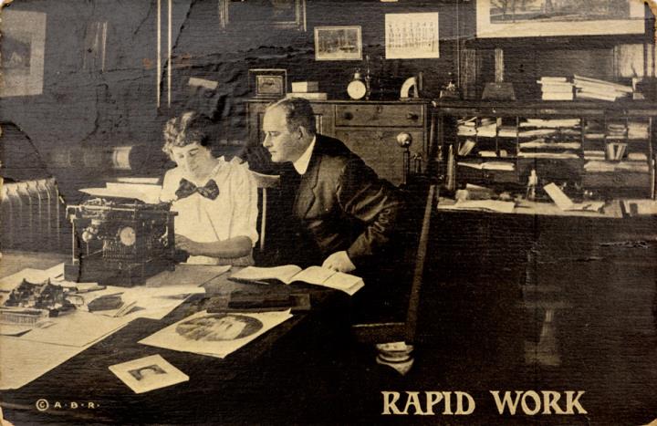 Illustrierte Postkarte; Fotografie, monochrom; Serie A.B.R. Rückseite: Büroszene; Vorgesetzter und Sekretärin mit Schreibmaschine Vorderseite: beschrieben und adressiert