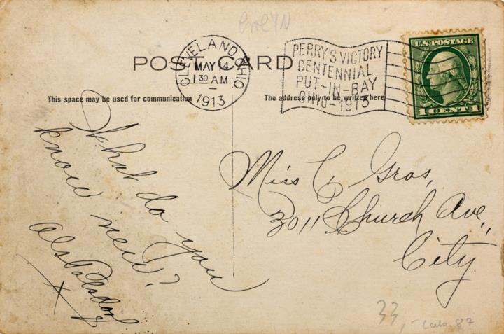 Illustrierte Postkarte; Fotografie, monochrom; Serie A.B.R. Rückseite: Büroszene; Sekretärin und Vorgesetzter mit Schreibmaschine in vertauschten Rollen Vorderseite: beschrieben; adressiert an Ms. Gros, City; Briefmarke U.S. Postage 1 Cent; Poststempel Cleveland/May 14 1913