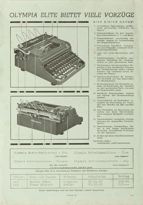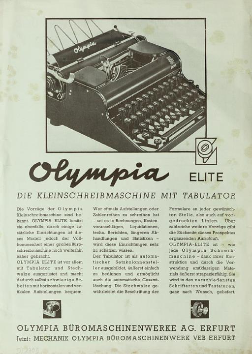 Prospekt für Schreibmaschine Olympia Elite Die Kleinschreibmaschine mit Tabulator Nr. 610 B142
