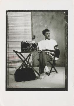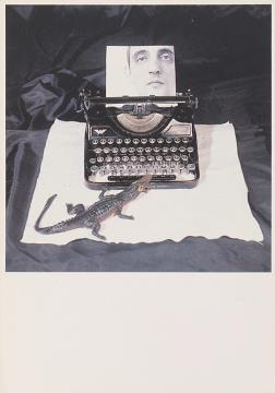 Illustrierte Postkarte; Fotografie, polychrom Rückseite: Schreibmaschine, Porträtfoto und Plastikkrokodil Vorderseite nicht beschrieben