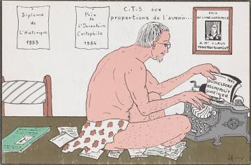 Illustrierte Postkarte; Grafik, polychrom; Nr. 242 Rückseite: Mann mit Schreibmaschine, am Boden sitzend Vorderseite mit französischem Text zum Postkartensammler Claus-Torsten Schmidt