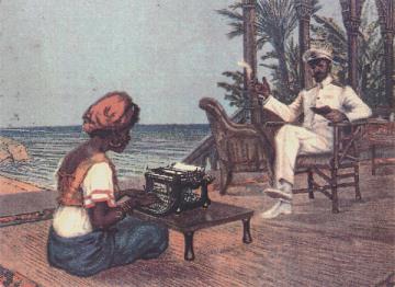 Illustrierte Postkarte; Grafik, polychrom Rückseite: Werbebild für Schreibmaschine Continental und ihre Verwendung in den Kolonien; Mann in Uniform und Sekretär mit Schreibmaschine Vorderseite: beschrieben, adressiert; Briefmarke Deutsche Bundespost 60 Pf., Poststempel Augsburg/08.08.1989