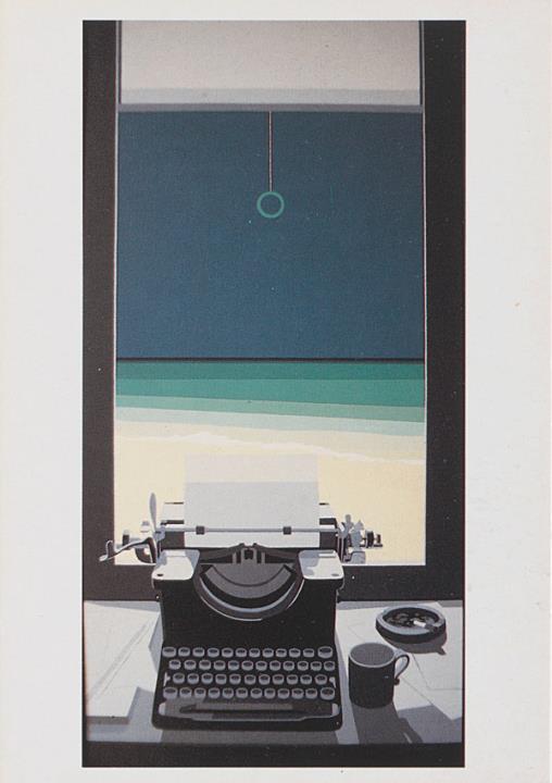 Illustrierte Postkarte; Grafik, polychrom Rückseite: Schreibmaschine vor einem Fenster mit Ausblick auf den Strand Vorderseite nicht beschrieben