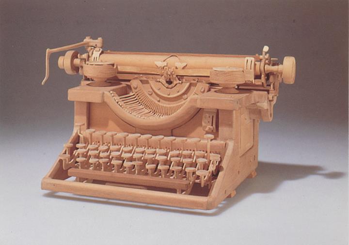 Illustrierte Postkarte; Fotografie, polychrom Rückseite: aus Holz geschnitzte Schreibmaschine Vorderseite nicht beschrieben