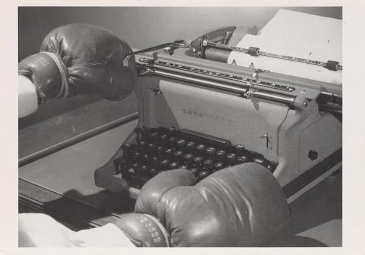 Illustrierte Postkarte; Fotografie, monochrom Rückseite: Hände in Boxhandschuhen mit Schreibmaschine Underwood Vorderseite nicht beschrieben