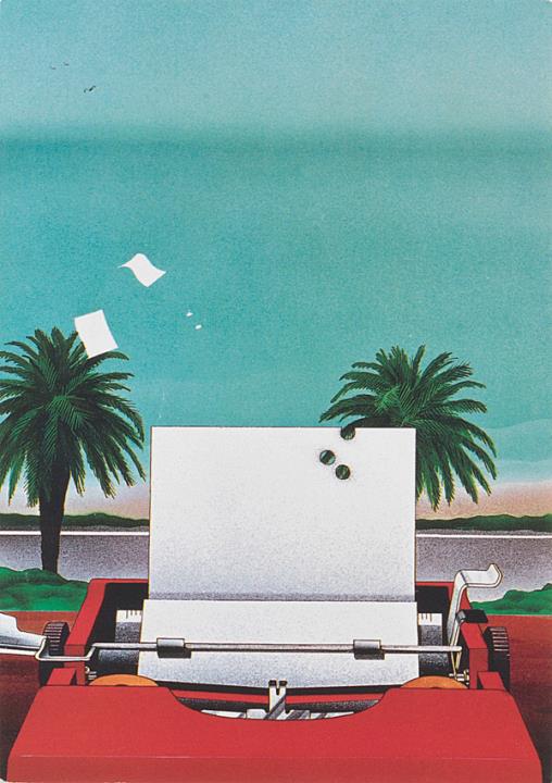 Illustrierte Postkarte; Grafik, polychrom Rückseite: Schreibmaschine mit durchlöchertem Blatt Papier Vorderseite: beschrieben, adressiert; Briefmarke Royal Mail 1 ST; Poststempel Hereford/2 Oct 1991