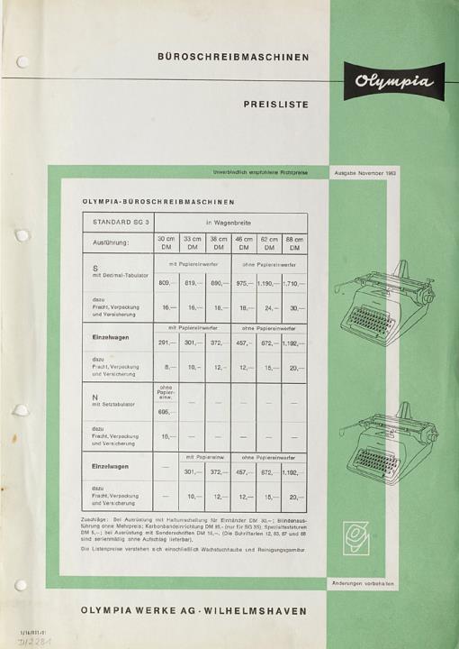 Preisliste für Schreibmaschine Olympia Ausgabe November 1963 Nr. 1/16/001/01