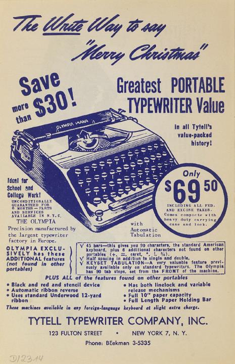 Next to literature on the history of technology, of the typewriter and the office, the Archive holds patent letters, textbooks and instruction manuals as well as historical postcards, letters, photographs and various kinds of advertising (leaflets and brochures, advertising stamps, newspaper ads, posters and signs, promotional gifts).