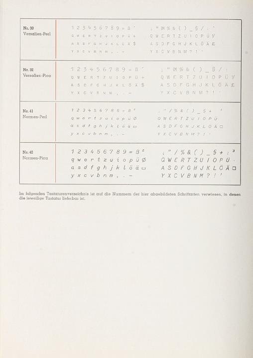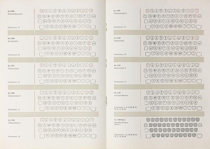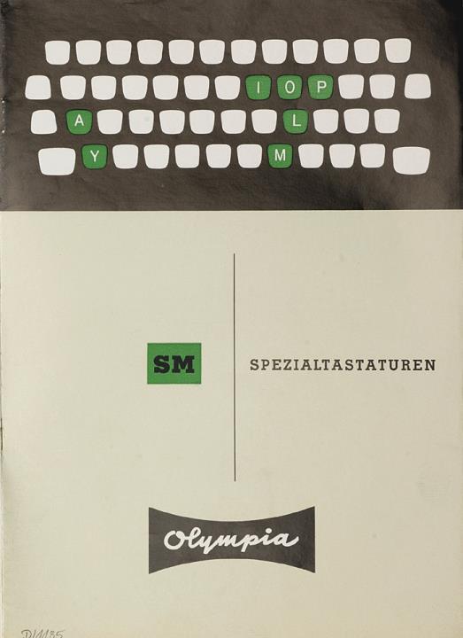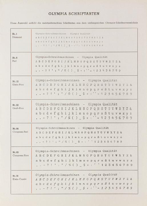Prospekt mit Schriftarten, Tastaturen und Sonderzeichen für Schreibmaschine Olympia SM Nr. N 1/13/014/01/C