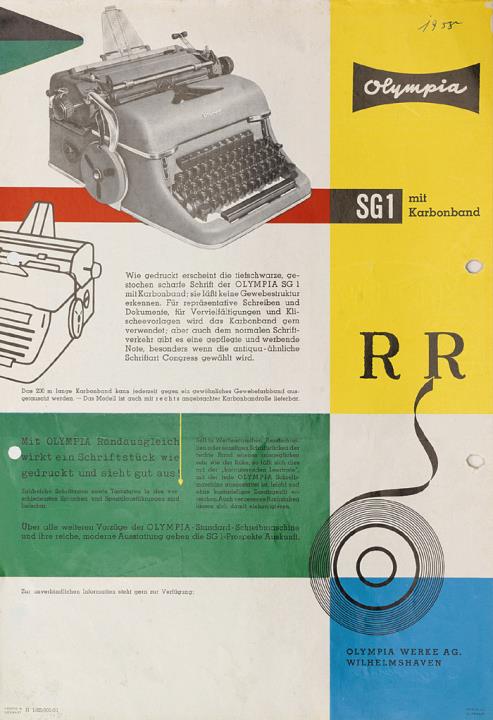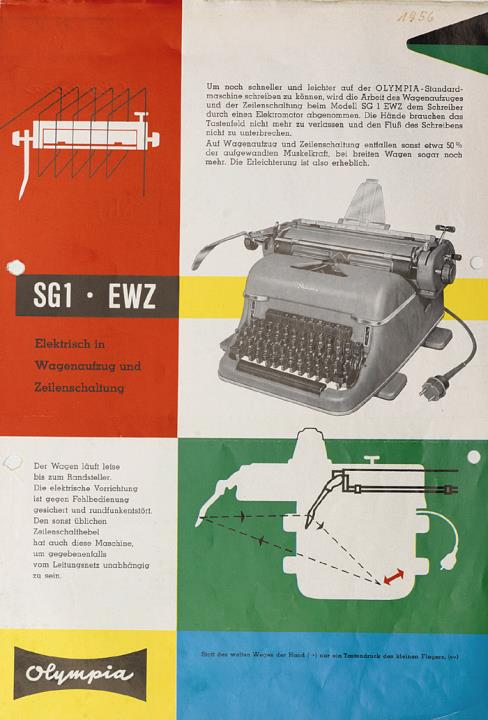 Prospekt für elektrische Schreibmaschine Olympia SG 1 Elektrisch in Wagenaufzug und Zeilenschaltung Datum handschriftlich vermerkt