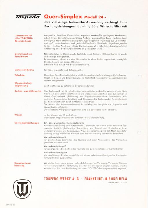 Prospekt für Schreib- und Buchungsmaschine Torpedo 24 volltextschreibende rechnende Buchungsmaschine Nr. d129-10-856