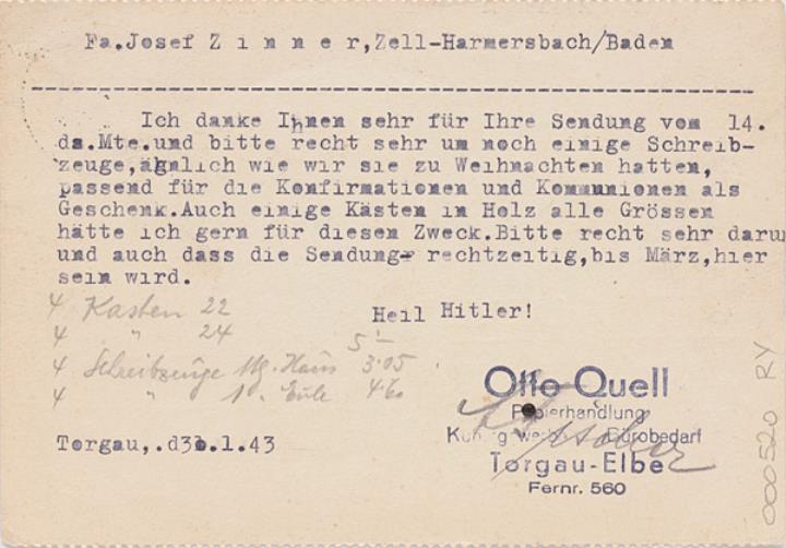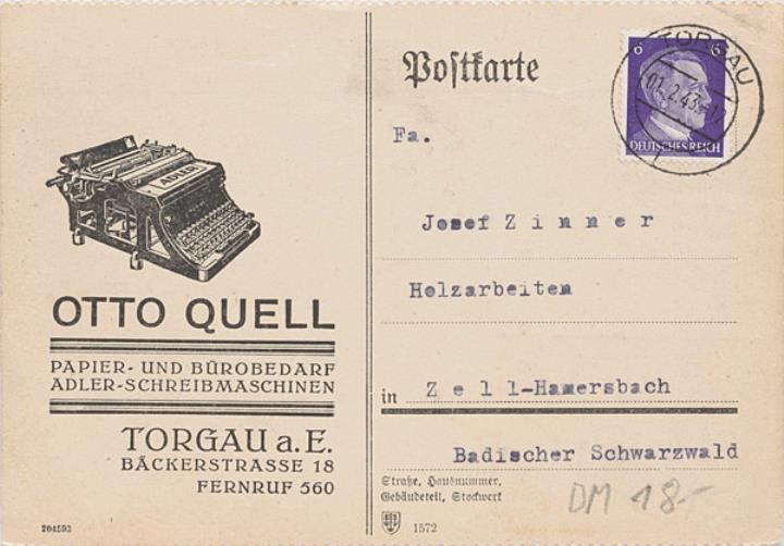 Postkarte mit Werbebild; Grafik, monochrom Vorderseite: Schreibmaschine Adler; adressiert an Fa. Josef Zinner, Zell-Hamersbach; Briefmarke Deutsches Reich 6 RPf.; Poststempel Torgau/01.02.1943 Rückseite beschrieben (Maschinenschrift)