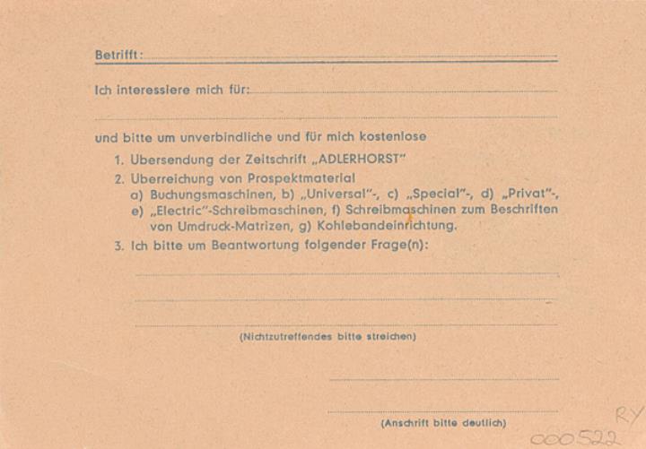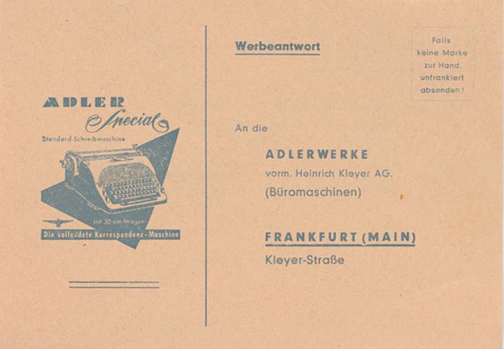 Antwortkarte; Grafik, monochrom Vorderseite: vorgedruckte Anschrift Adlerwerke vorm. Heinrich Kleyer AG, Frankfurt Rückseite: vorgedruckter Bestelltext