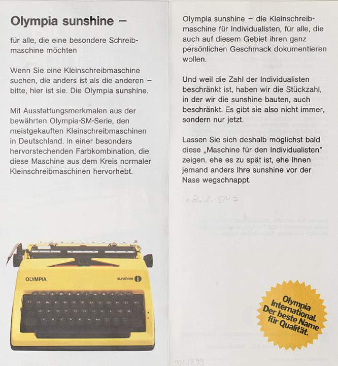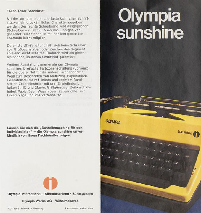 Faltprospekt für Schreibmaschine Olympia sunshine Nr. VWS 1305