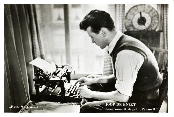 Illustrierte Postkarte; Fotografie, monochrom; Foto: W. Dussel Rückseite: Sänger Joop De Knegt mit Schreibmaschine (beim Beantworten seiner täglichen Fanpost) Vorderseite nicht beschrieben