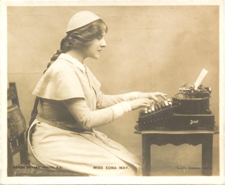 Illustrierte Postkarte in Midget-Format; Fotografie, monochrom; Rotary Photo Nr. 6849 Rückseite: Rollenporträt; Schauspielerin Edna May mit Schreibmaschine Vorderseite nicht beschrieben