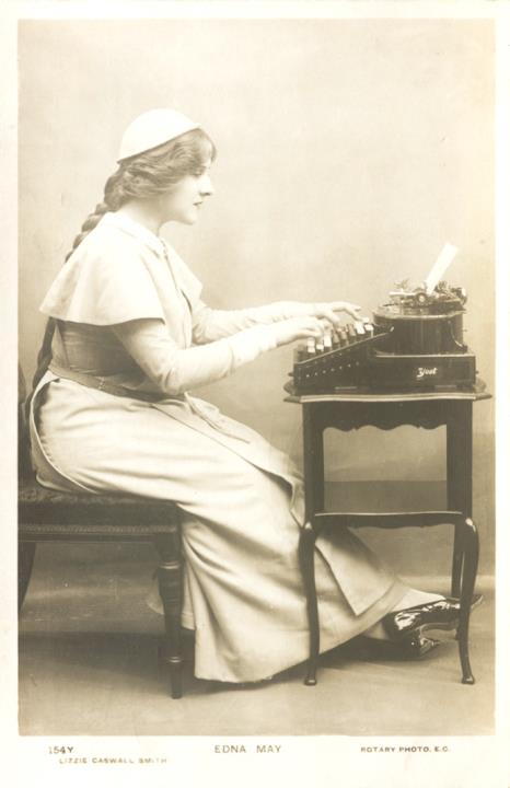 Illustrierte Postkarte; Fotografie, monochrom; Rotary Photo Nr. 154 Y Rückseite: Rollenporträt; Schauspielerin Edna May mit Schreibmaschine Vorderseite nicht beschrieben