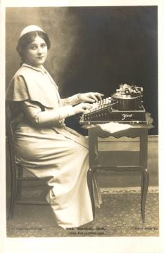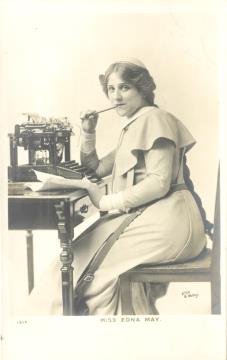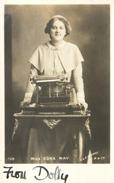 Illustrierte Postkarte; Fotografie, monochrom; J.B. % Co. Nr. 1217 Rückseite: Rollenporträt; Schauspielerin Edna May mit Schreibmaschine Vorderseite nicht beschrieben