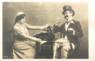 Illustrierte Postkarte; Fotografie, monochrom; Rotary Photo Nr. 3161 F Rückseite: gestelltes Szenenfoto; Schauspieler G. P. Huntley und Edna May mit Schreibmaschine Yost Vorderseite nicht beschrieben