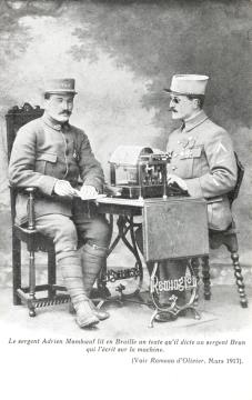 Illustrierte Postkarte; Fotografie, monochrom; La famille du Rameau d'Olivier, Carte N. 22; Rückseite: zwei Männer in Uniform mit Schreibmaschine Remington Vorderseite nicht beschrieben