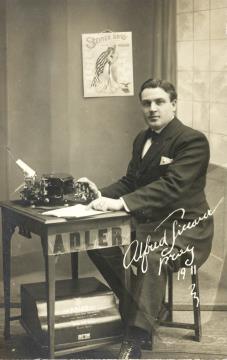Illustrierte Postkarte mit Autogramm; Fotografie, monochrom Rückseite: Opernsänger Alfred Piccaver mit Schreibmaschine Adler, im Hintergrund Werbebild der Schreibmaschinenhandlung Steiner Bros. Prague Vorderseite nicht beschrieben