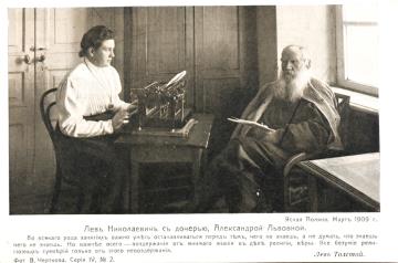 Illustrierte Postkarte; Fotografie, monochrom; Serie IV, Nr. 2; Rückseite: Schriftsteller Lew Nikolajewitsch Tolstoi und seine Tochter Alexandra Lvovna mit Schreibmaschine; Jasnaja Poljana, März 1909 Vorderseite nicht beschrieben