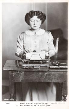Illustrierte Postkarte; Fotografie, monochrom; J.B. & Co. Nr. 389.H Rückseite: Rollenporträt; Schauspielerin Hilda Trevelyan mit Schreibmaschine; Vorderseite nicht beschrieben