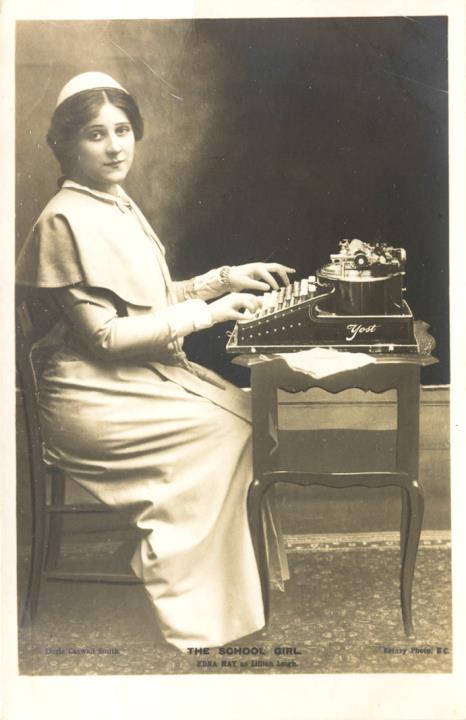 Illustrierte Postkarte; Fotografie, monochrom; Rotary Photo Rückseite: Rollenporträt; Schauspielerin Edna May mit Schreibmaschine Yost Vorderseite nicht beschrieben