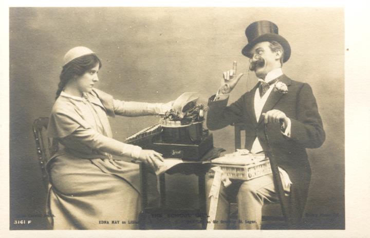 Illustrierte Postkarte; Fotografie, monochrom; Rotary Photo Nr. 3161 F Rückseite: gestelltes Szenenfoto; Schauspieler G. P. Huntley und Edna May mit Schreibmaschine Yost Vorderseite nicht beschrieben
