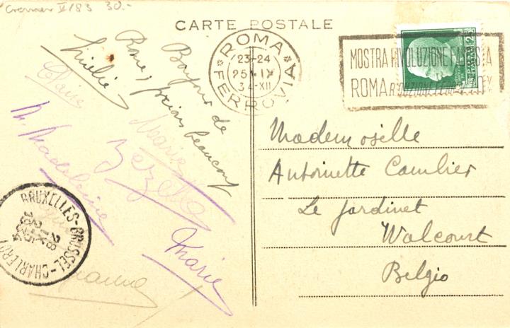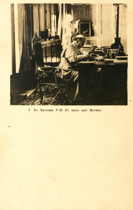 Illustrierte Postkarte; Fotografie, monochrom; Rückseite: Papst Pius XI in seinem Büro Vorderseite: beschrieben; adressiert an Mademoiselle Camlier, Walcourt; Briefmarke Poste Italiane 2 cent.; Poststempel Roma Ferrovia 25 IX 1934