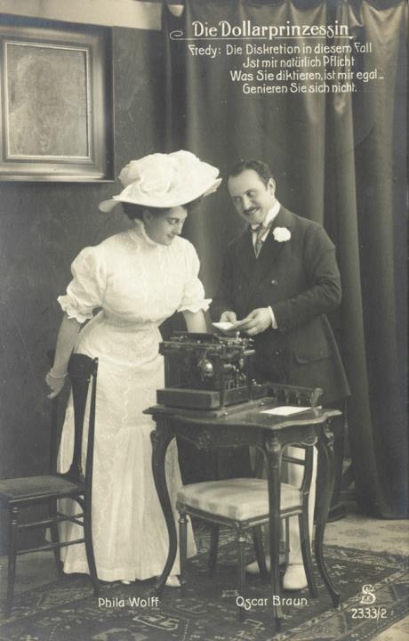 Illustrierte Postkarte; Fotografie, monochrom; Nr. 2333/2; Rückseite: gestelltes Szenenfoto aus der Operette "Die Dollarprinzessin"; Schauspieler Phila Wolff und Oscar Braun (Alice/Fredy) mit Schreibmaschine, oben rechts Textzeile aus dem Stück: Die Diskretion in diesem Fall [...] Vorderseite: beschrieben; adressiert an Fräulein Schulze, Zerbst Anhalt; Briefmarke Deutsches Reich 5 Pf., Poststempel Freiburg/4.5.1909