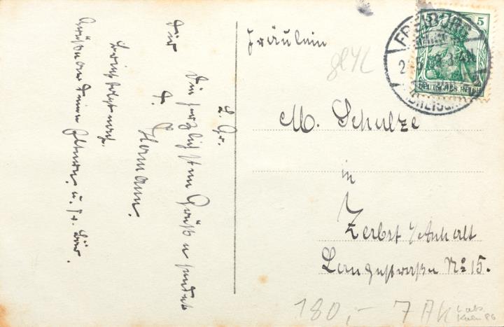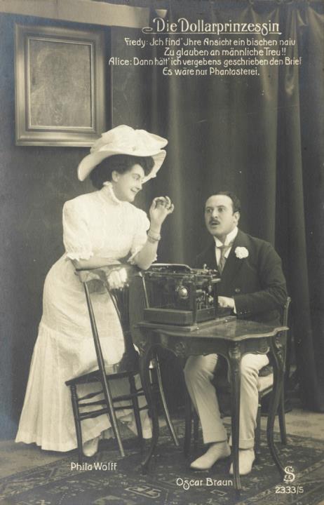 Illustrierte Postkarte; Fotografie, monochrom; Nr. 2333/5 Rückseite: gestelltes Szenenfoto aus der Operette "Die Dollarprinzessin"; Schauspieler Phila Wolff und Oscar Braun (Alice/Fredy) mit Schreibmaschine, oben rechts Textzeile aus dem Stück: Ich find' Ihre Ansicht ein bischen naiv [...] Vorderseite: adressiert an Fräulein Schulze, Zerbst Anhalt; Briefmarke Deutsches Reich 5 Pf., Poststempel Freiburg/2.5.1909