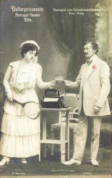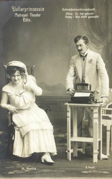 Illustrierte Postkarte; Fotografie, monochrom; Rotary Photo Rückseite: Szenenfoto aus der Operette "Die Dollarprinzessin"; Schauspielerin und Schauspieler mit Schreibmaschine Remington Vorderseite nicht beschrieben