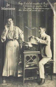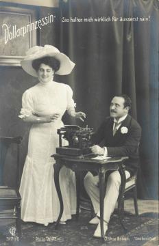 Illustrierte Postkarte; Fotografie, monochrom; Nr. 2267/4 Rückseite: gestelltes Szenenfoto aus der Operette "Die Dollarprinzessin"; Schauspielerin und Schauspieler mit Schreibmaschine, oben rechts Textzeile aus dem Stück: Kann ich auf Deine Treue bau'n? [...] Vorderseite beschrieben